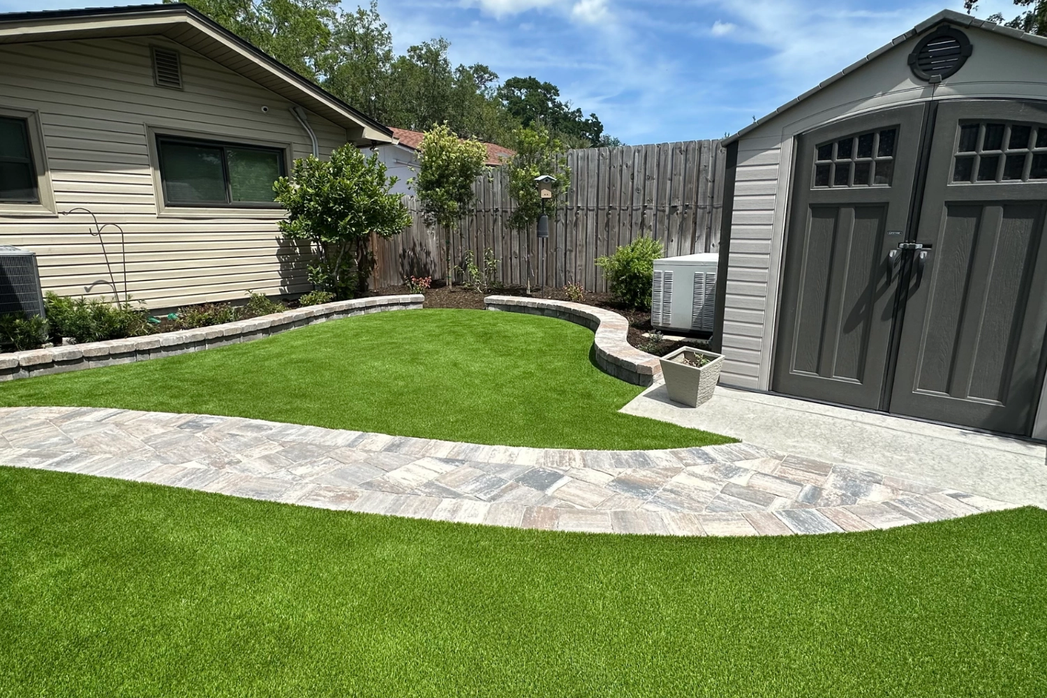 • Artificial Turf Systems: Durable, pet-friendly turf that stays green year-round and improves drainage away from the home.